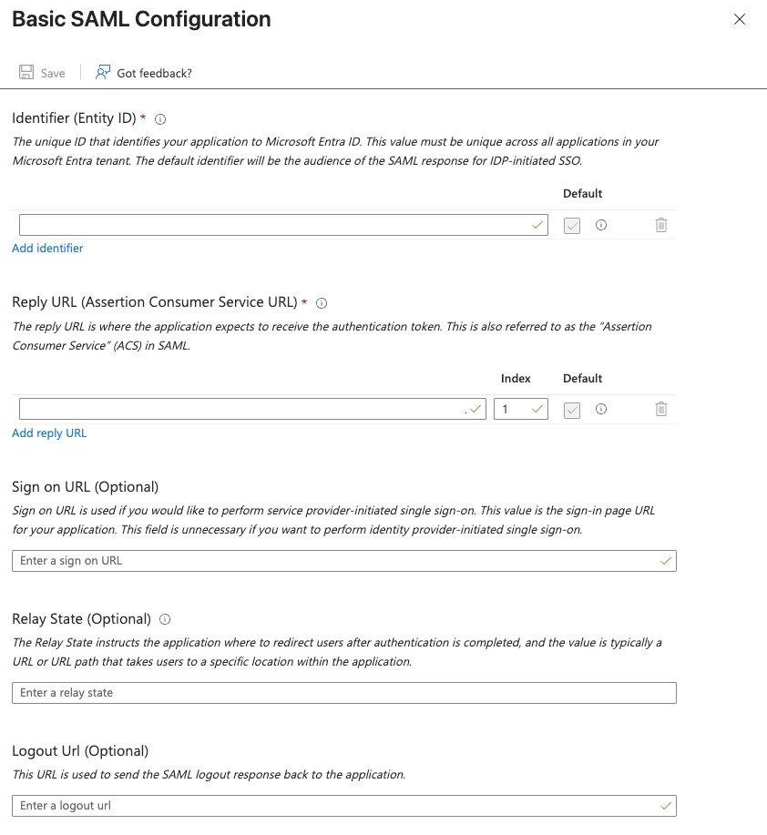 - In the Basic SAML Configuration section, click Edit and configure the following: