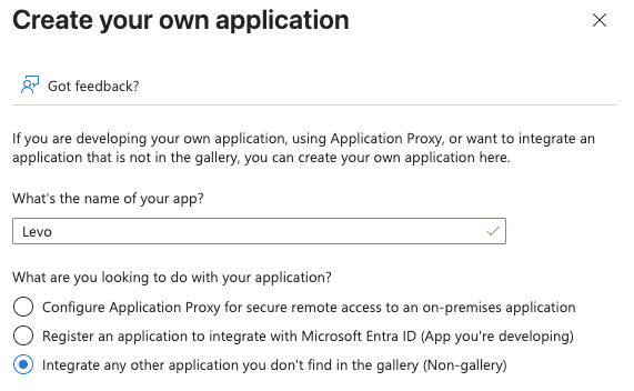 - Enter Levo as the application name, select Integrate any other application you don't find in the gallery (Non-gallery), and click Create.