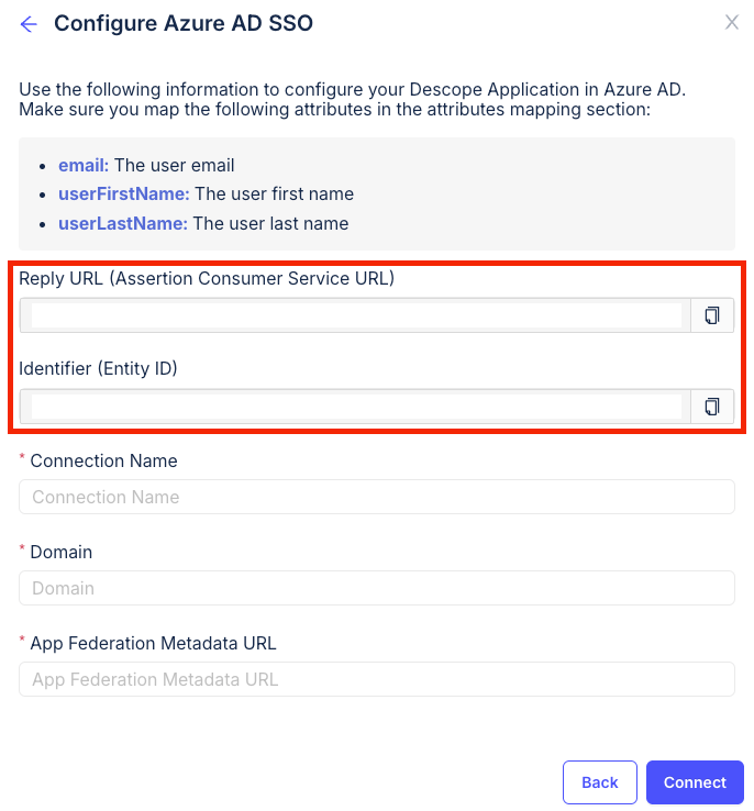 - App Federation Metadata URL: The App Federation Metadata URL you copied from Azure AD.