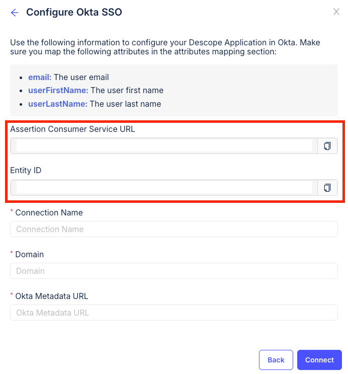 - Copy the Assertion Consumer Service URL (ACS URL) and Entity ID. These will be used during the Okta app creation.